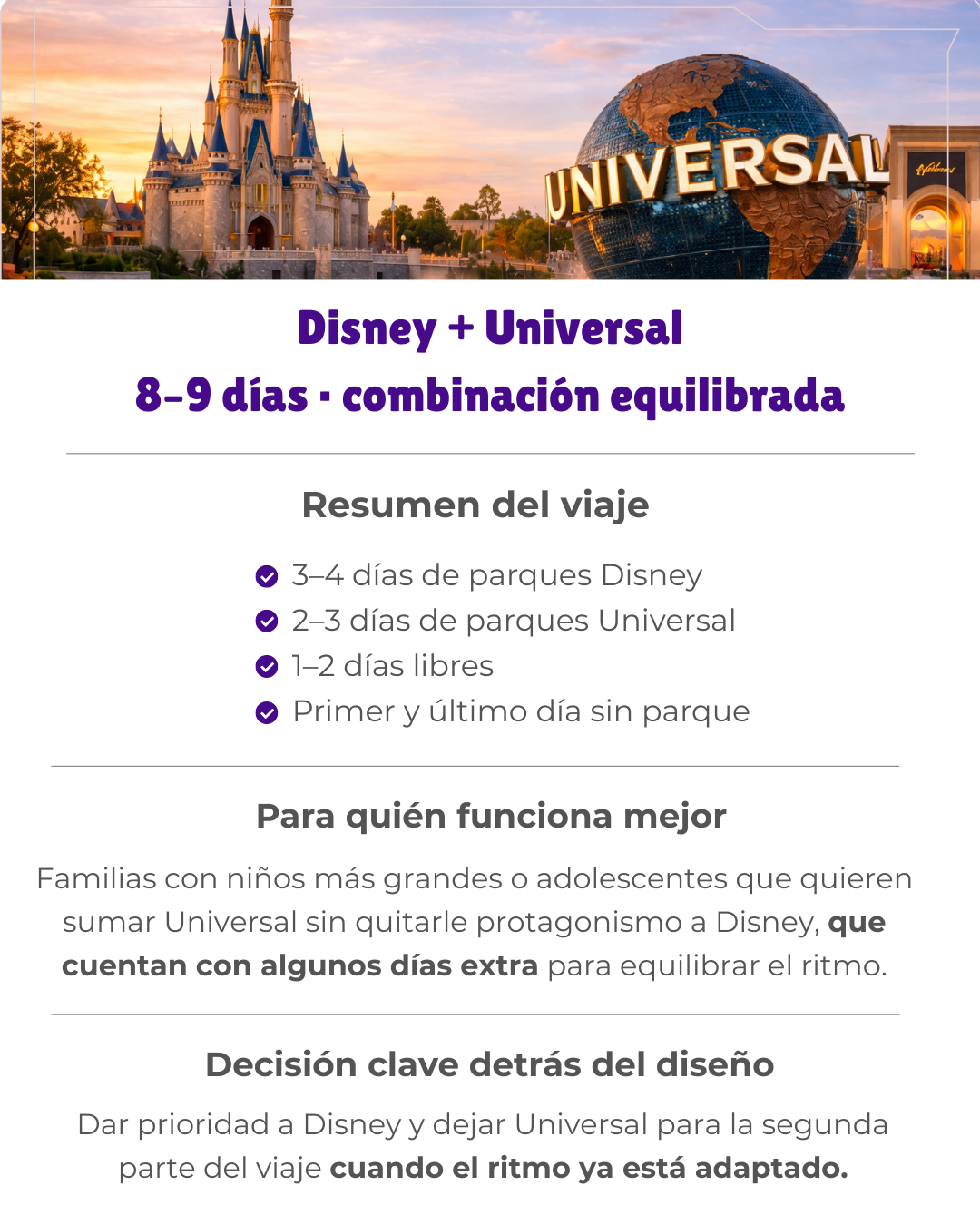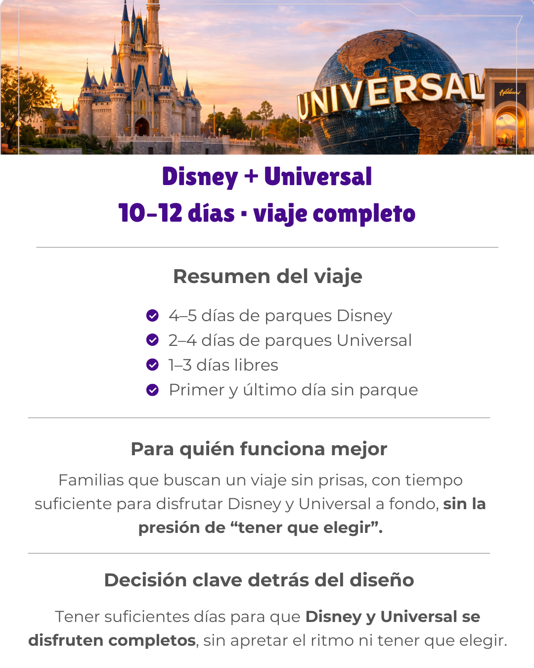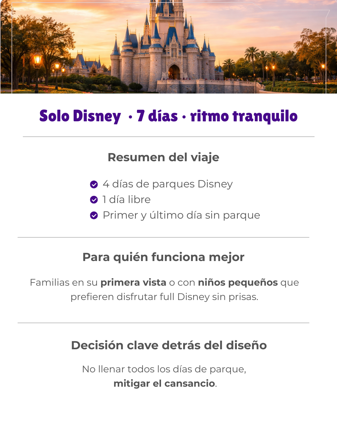 Estos son ejemplos reales de cómo diseñamos los viajes según duración, parques y ritmo familiar. No son paquetes cerrados, solo referencias para que imagines un viaje bien planeado.